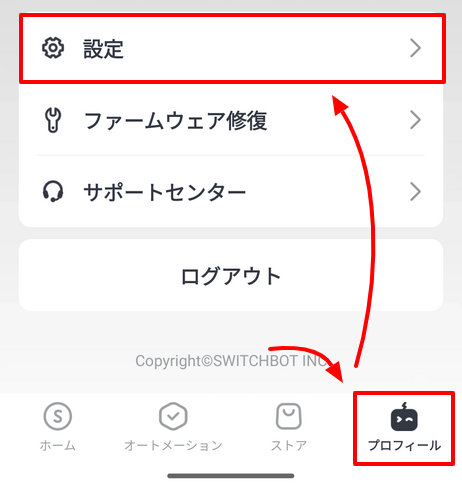まず画面下にある「プロフィール > 設定」を選択します。