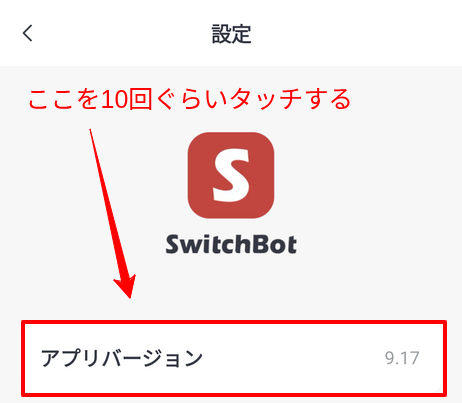 「アプリバージョン」という項目が表示されるので、ここを10回ぐらいタッチします。