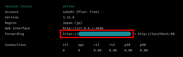 すると、以下のような表示になるので、「Forwarding」の部分に書いてあるURLを覚えておいてください(キャンセルする場合はCtr + C)です。