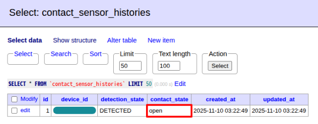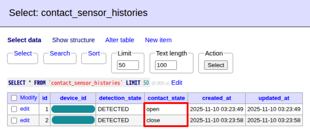 WebHookを通じて検知されたデータがデータベースに保存されているのがわかりますね。データもopenになっています。