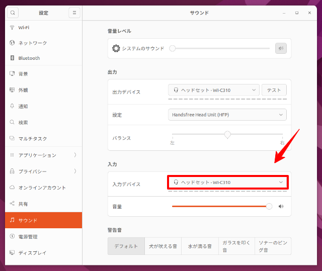 このイヤホンをBluetoothでパソコンに接続したら、サウンドの入力設定を変更し、マイクの音を取得するようにします。