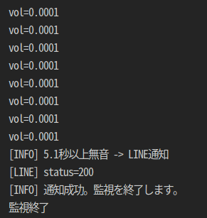 はい!Python上ではうまく無音をトリガーにして通知してくれました。